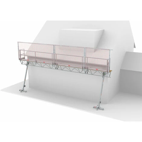 Durch die Kombination der ausgeklügelten Gerüstpfeiler mit Sicherheitsnetzen von 2, 3 oder 4 m Länge sind verschiedene Längen möglich. Darüber hinaus können die Gerüstpfeiler durch die offene V-Form gestapelt und somit kompakt transportiert werden. Anti-Rutsch-Böden und Geländerrahmen mit Bordbrett und Knieleiste gewährleisten eine sichere Nutzung.