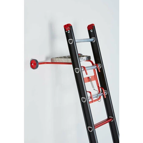 Wandabstandhalter mit Wandlaufrollen und Werkzeugablage. Bessere Erreichbarkeit auf einer Leiter