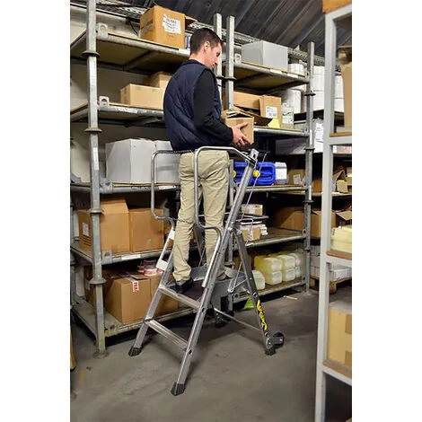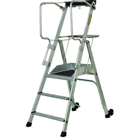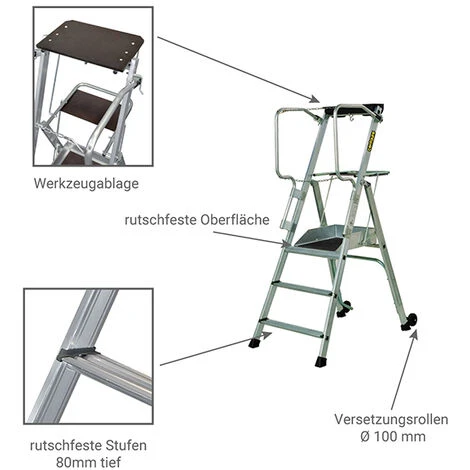 – Podestleiter mit 2 Paket-Ablageplatten mit maximaler Tragelast 25kg.