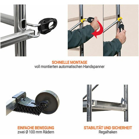 – Treppengängig dank Höhenregulierung (durch Verschieben der Leitern in Schritten von 0,30 bis 0,60 m).