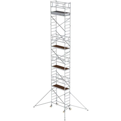 Das ideale Rollgerüst wenn enge Platzverhältnisse herrschen. Die verstellbaren Ausleger schaffen vielerlei Möglichkeiten der Anbringung. Bei ausgeklappten Auslegern steht das Gerüst fest auf jedem Untergrund und garantiert sicheres Arbeiten in großen Höhen. Mit eingeklappten Auslegern lässt es sich problemlos durch Gänge, Türen etc. zum Einsatzort schieben oder für den wandseitigen Aufbau verwenden. Niedriges Gewicht, Steckverbindungen an den Rahmenteilen, Schnellverschlüsse an den Streben, exakter Höhenausgleich durch Spindeln und 4 große Lenkrollen Ø 200 mm mit zentrischer Lasteinleitung stehen für einfache Handhabung. Auch bei diesem Rollgerüst-Typ sind alle Gerüstteile als Ersatz- oder Erweiterungsteil auch einzeln erhältlich. Sie haben die Wahl zwischen 3 Gerüstgrößen: 0,75 x 1,80 m, 0,75 x 2,45 m oder 0,75 x 3,00 m.