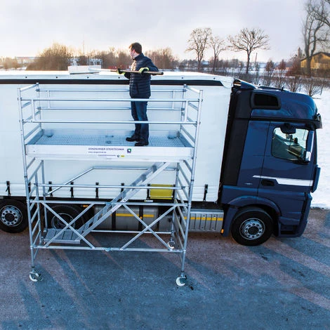 - Sicherer Aufstieg über Schrägaufstieg mit Handlauf und komfortablen 100 mm tiefen Stufen aus Aluminium- Lochblech (Rutschklasse R 13) und Antrittstufe