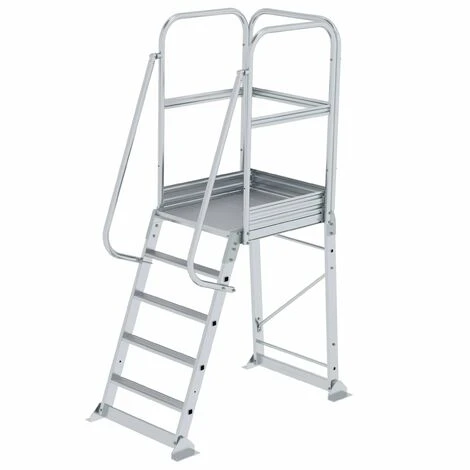 - Dreiseitiges Plattformgeländer 1100 mm mit Fuß- und Knieleisten sowie beidseitige Handläufe serienmäßig