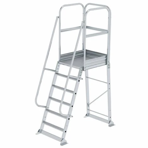 - Dreiseitiges Plattformgeländer 1100 mm mit Fuß- und Knieleisten sowie beidseitige Handläufe serienmäßig