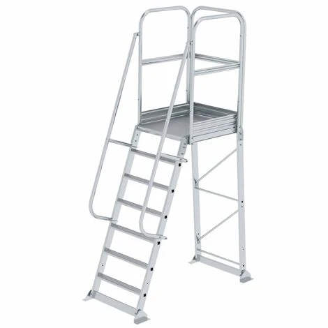 - Dreiseitiges Plattformgeländer 1100 mm mit Fuß- und Knieleisten sowie beidseitige Handläufe serienmäßig