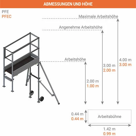 – Maße des geklappten Gerüsts: 1,72m x 0,67m x 1,98m.
