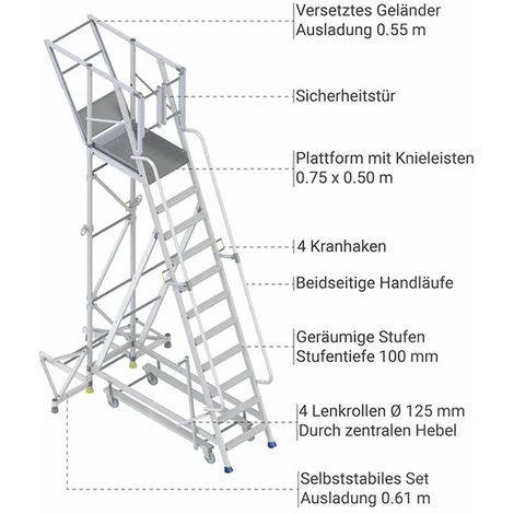 – Arbeitsbühne 0,75 x 0,50 m mit Geländer.
