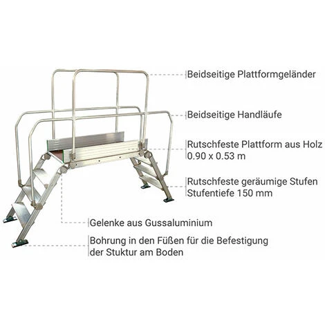 – Komfort und Sicherheit: Rutschfeste Stufen 15cm tief, Handlauf und Plattformgeländer 100cm hoch beidseitig