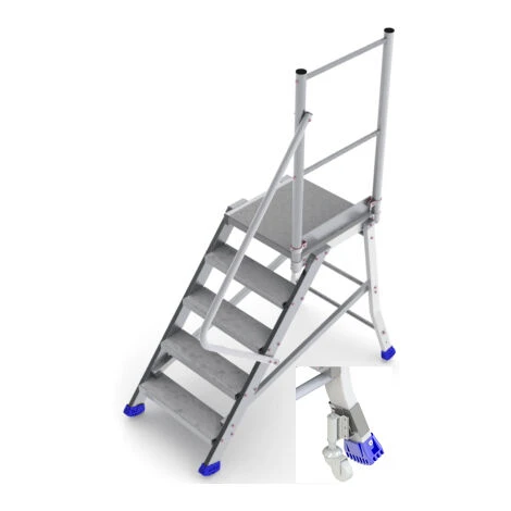 – Plattformtreppe rollbar mit 4 sich einziehenden Rollen und automatischer Bremsfunktion bei Benutzung.