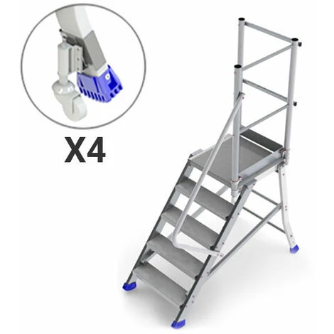 – Plattformtreppe rollbar mit 4 sich einziehenden Rollen und automatischer Bremsfunktion bei Benutzung.